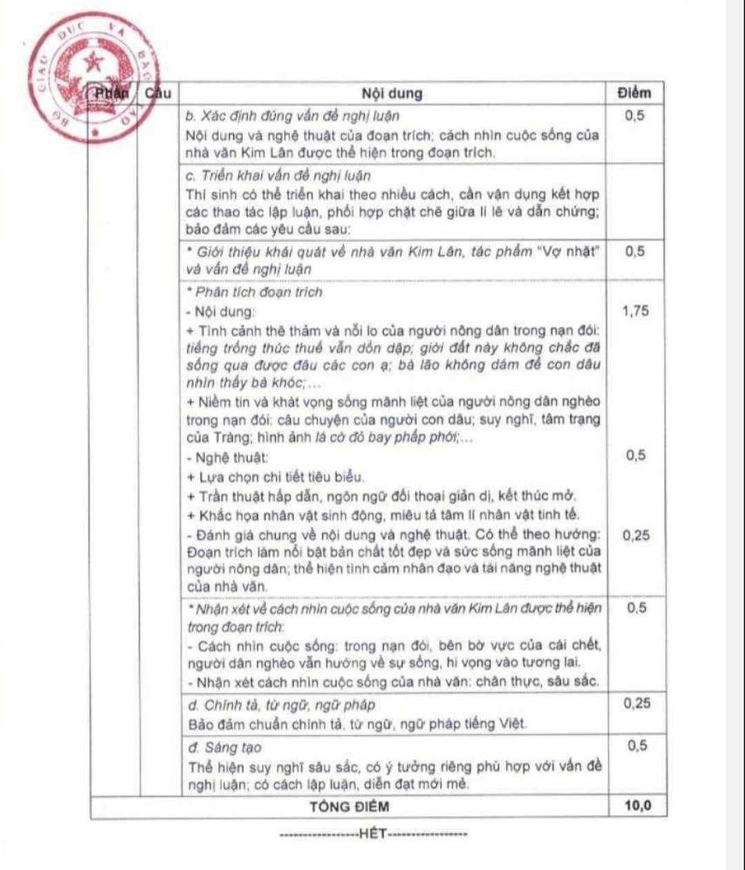 Đáp án môn Ngữ văn được Bộ GD&ĐT gửi về 63 tỉnh thành nhằm hướng dẫn công tác chấm thi.