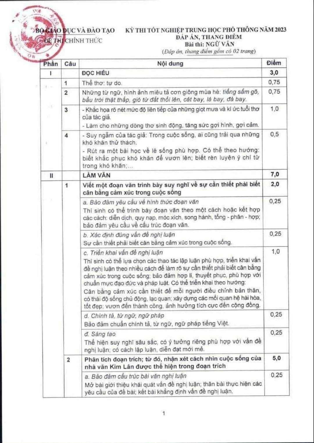 Đáp án chính thức môn Ngữ văn thi tốt nghiệp THPT 2023