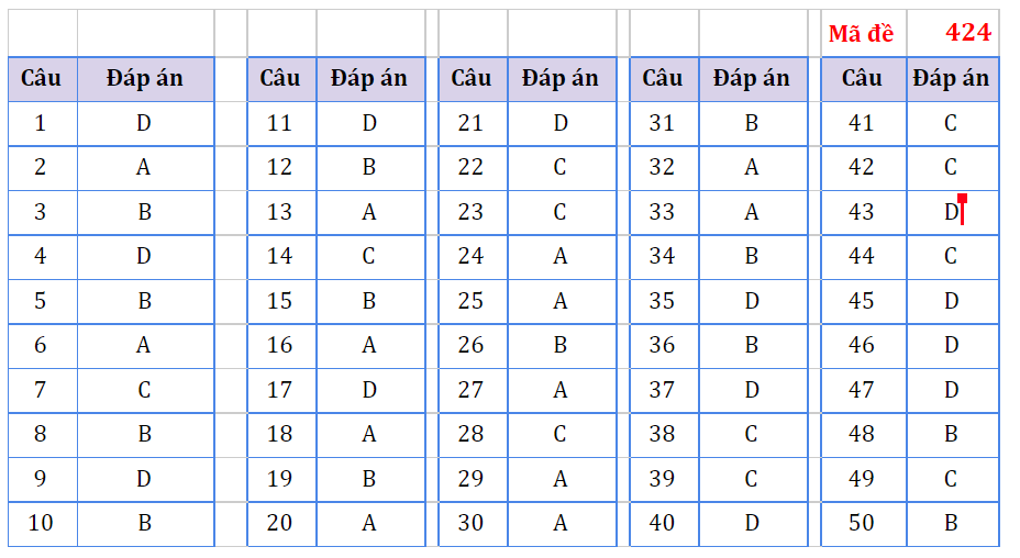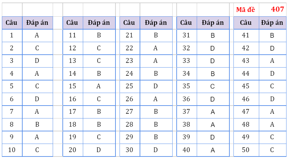 Đáp án của các mã đề còn lại đang tiếp tục được cập nhật...