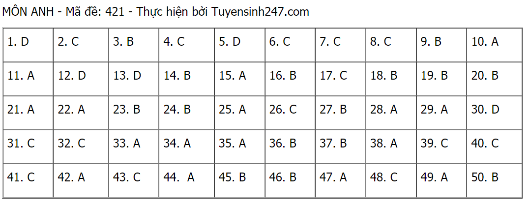Lưu ý: Đáp án dưới đây chỉ có giá trị tham khảo trước khi Bộ GD&ĐT chính thức công bố đáp án chuẩn.