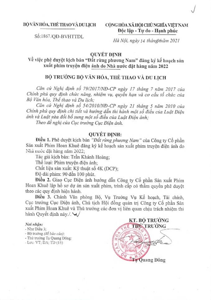 Công văn ghi: "Căn cứ công văn số 18676/QĐ-BVHTTDL của Bộ trưởng Bộ VHTTDL về việc phê duyệt kịch bản Đất rừng phương Nam theo kế hoạch sản xuất phim truyện điện ảnh do Nhà nước đặt hàng".