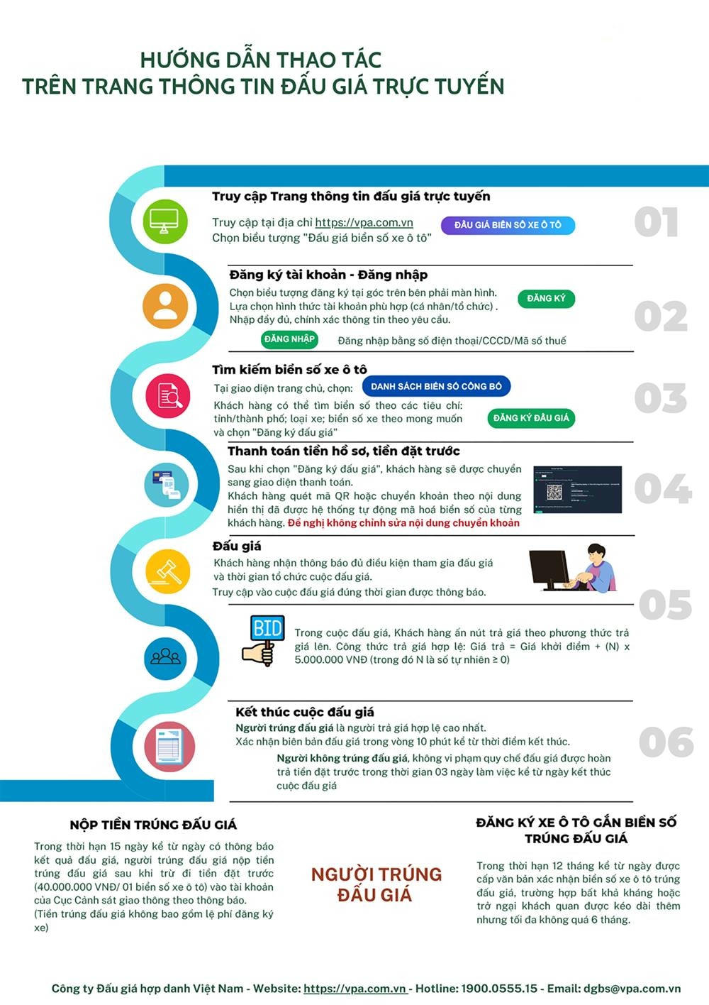 Tổ chức, cá nhân có nhu cầu có thể truy cập vào một trong các địa chỉ nêu trên để lựa chọn biển số; tạo tài khoản, đăng ký tham gia đấu giá biển số xe ô tô trên Trang thông tin đấu giá trực tuyến của Công ty Đấu giá hợp danh Việt Nam theo đường dẫn: http://dgbs.vpa.com.vn.