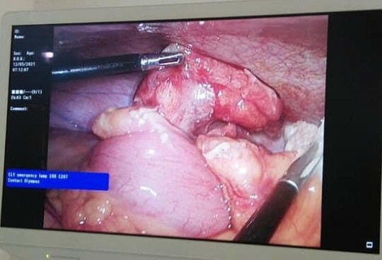 Qua máy nội soi, thầy thuốc phát hiện ruột thừa đã căng mọng, có giả mạc. Bằng kinh nghiệm và tận tâm, kíp phẫu thuật đã xử lý an toàn.