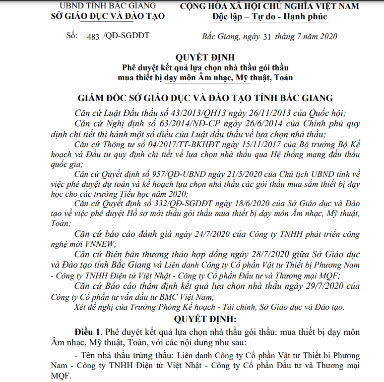 Cụ thể, ngày 31/7/2020 ông Trần Tuấn Nam - Giám đốc Sở GD&ĐT tỉnh Bắc Giang ký ban hành quyết định số 483/QĐ-SGDĐT phê duyệt kết quả lựa chọn Liên danh nhà thầu Công ty cổ phần Vật tư Thiết bị Phương Nam - Công ty TNHH Điện tử Việt Nhật - Công ty cổ phần Đầu tư và Thương mại MQF trúng gói thầu Mua thiết bị dạy môn Âm nhạc, Mỹ thuật, Toán với giá 15 tỷ 477 triệu đồng. Được biết, giá gói thầu là 15 tỷ 544 triệu đồng, như vậy mức tiết kiệm ngân sách cho gói thầu này là 33 triệu (tỷ lệ 0,43%).