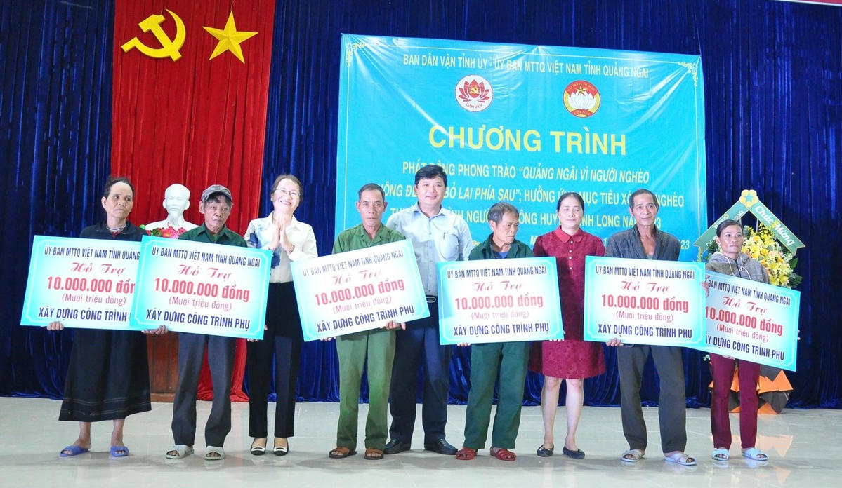 Dịp này, Ban Dân vận Tỉnh ủy phối hợp với Ủy ban MTTQ Việt Nam tỉnh Quảng Ngãi cùng các nhà hảo tâm, doanh nghiệp đã trao hỗ trợ xây dựng 3 căn nhà, 13 nhà tiêu hợp vệ sinh và 6 ti vi cho các hộ nghèo là người có công trên địa bàn huyện Minh Long, với tổng trị giá gần 400 triệu đồng.