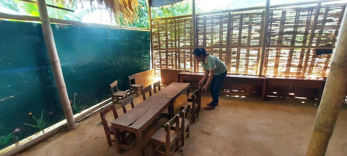 Vừa buộc những mối lạt cuối cùng cho tấm liếp ở chái lớp học, ông Hà Văn Thống – một người dân trú tại bản Phé cho tôi hay: Nhiều năm trước, học sinh ở điểm lẻ này phải học tạm bằng những căn nhà tranh tre nứa lá do bà con trong bản góp vật liệu để dựng lên. Đến năm 2020, điểm trường này đã được một tổ chức từ thiện xây dựng cho 2 phòng học kiên cố. Tuy nhiên, do chiếc cầu bắc qua sông bị lũ cuốn trôi nên học sinh ở ba bản Phé, Bá, Mí đều phải học ở điểm lẻ dẫn đến quá tải. Chính quyền đã huy động bà con nhân dân góp vật liệu và công sức để dựng thêm hai phòng học tranh tre để các con theo đuổi con chữ. Bởi thế, năm nào cũng vậy cứ vào trước năm học mới, bà con cùng giáo viên cắm bản lại lên rừng chặt tre, nứa, lá cọ vận chuyển về trường để gia cố lại hai phòng học cho các con. “Năm nào nhà trường cũng tu sửa bàn, ghế và lợp lại mái tranh bằng tre. Gia đình mình không có tiền nên góp ngày công, vật liệu giúp nhà trường. Ở trường thiếu thốn nhiều thứ, phụ huynh chung tay để tiếp thêm động lực cho các cô cắm bản”, ông Thống chia sẻ.