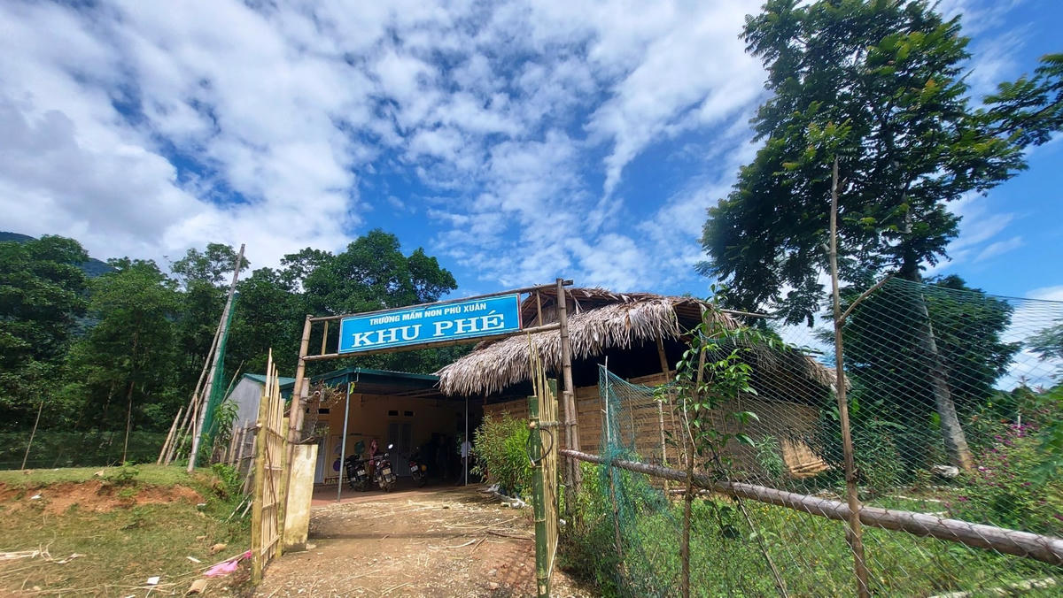 Mặt trời đứng bóng, chúng tôi mới đến được bản Phé - điểm lẻ của Trường Mầm non Phú Xuân. Đây là điểm trường đang phục vụ cho gần 60 học sinh từ 18 -24 tháng tuổi. Đã gần quá trưa thế nhưng bà con và giáo viên ở đây vẫn chưa nghỉ ngơi. Người căng lại bạt, người chống lại cột kèo để mùa mưa các con không bị dột; các cô giáo thì mang bàn ghế, bát đĩa ra rửa…