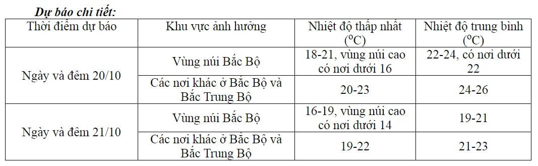 Từ đêm 20/10, ở khu vực Bắc Bộ và Bắc Trung Bộ trời chuyển lạnh, vùng núi phía Bắc có nơi trời rét. Trong đợt không khí lạnh này nhiệt độ thấp nhất ở Bắc Bộ và Bắc Trung Bộ phổ biến từ 19-22 độ, riêng khu vực vùng núi Bắc Bộ phổ biến 16-19 độ, vùng núi cao có nơi dưới 14 độ.
