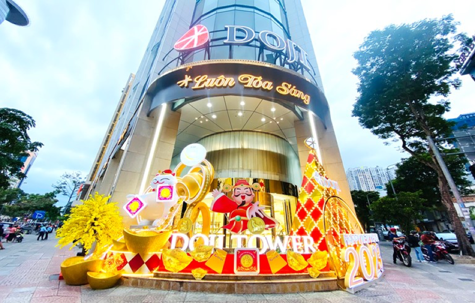 DOJI Tower được trang trí cực kỳ ấn tượng, nổi bật với hình ảnh Mèo Vàng khổng lồ – linh vật của năm 2023, Tháp Ngọc với tông màu đỏ - vàng hút mắt như những viên đá quý thượng hạng đại diện cho sự phú quý, thịnh vượng. Đặc biệt, ở giữa trung tâm là hình ảnh Ông Thần Tài cùng các đồng Vàng xung quanh tượng trưng cho may mắn, tài lộc dồi dào.