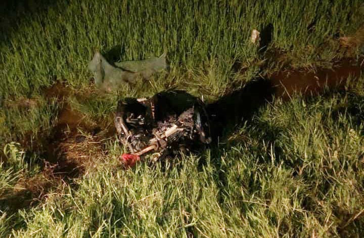 Tại hiện trường, vụ va chạm khiến xe máy bị hư hỏng nặng, nhiều vết máu loang lỗ trên đường.