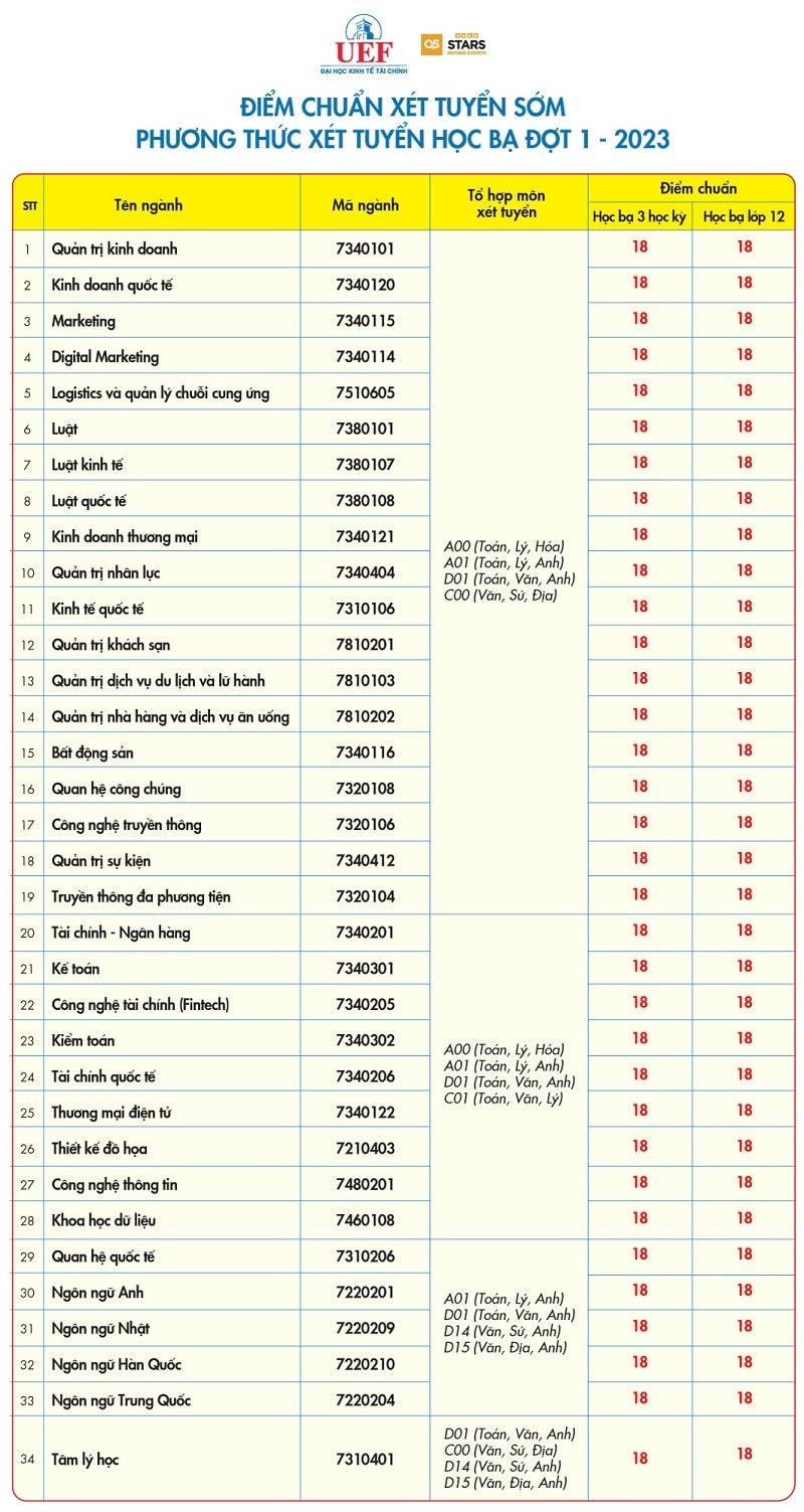 Hội đồng tuyển sinh Trường Đại học Kinh tế - Tài chính TP Hồ Chí Minh đã công bố điểm chuẩn xét tuyển sớm đối với phương thức xét học bạ THPT đợt 1 - 2023 của 34 ngành đào tạo trình độ đại học chính quy.