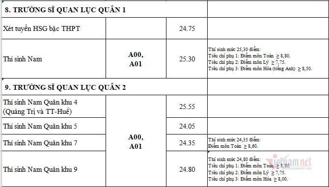 Điểm chuẩn vào Học viện Kỹ thuật Quân sự và các trường quân đội năm 2020 cụ thể như sau: