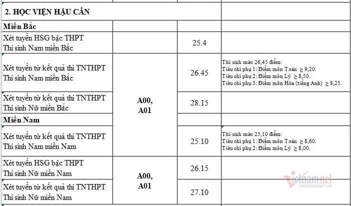 Ngày 5/10, các trường đại học, cao đẳng quân đội đã công bố điểm chuẩn năm 2020. Điểm trúng tuyển vào Học viện kỹ thuật quân sự với thí sinh nam miền Bắc cao nhất là 26,50. Học viện Quân Y với thí sinh nữ miền Bắc cao nhất là 28,65.
