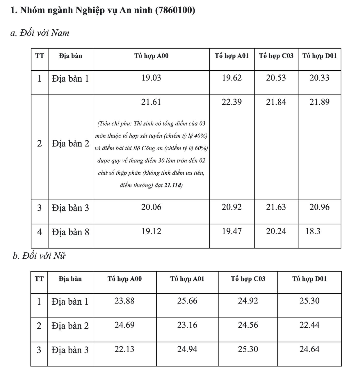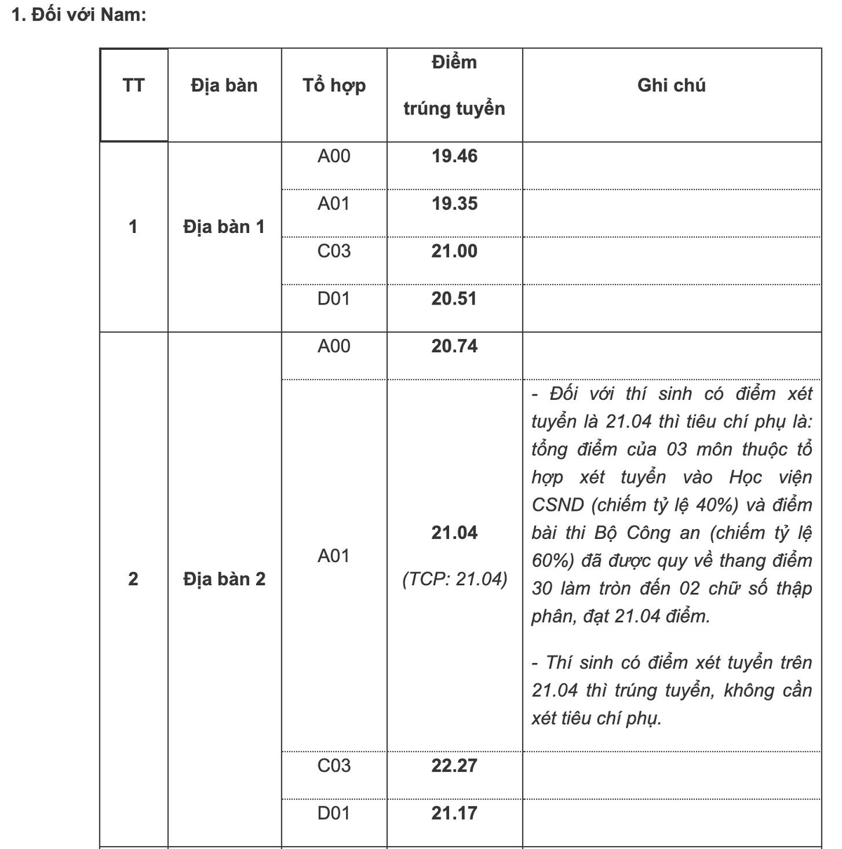 Điểm chuẩn Trường Đại học An ninh nhân dân cụ thể như sau:
