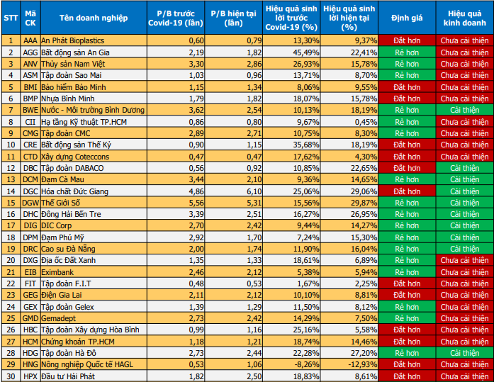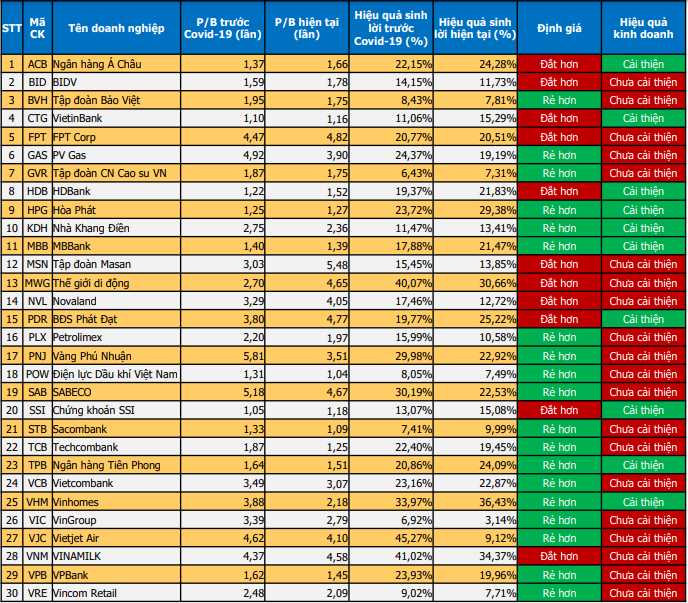 Kết quả tại nhóm VN30 cho thấy, có 13/30 cổ phiếu đang ghi nhận định giá P/B hiện tại cao hơn trước Covid-19, mặc dù vậy, chỉ 10/30 doanh nghiệp ghi nhận tình hình hiệu quả kinh doanh khả quan hơn so với thời điểm trước dịch.