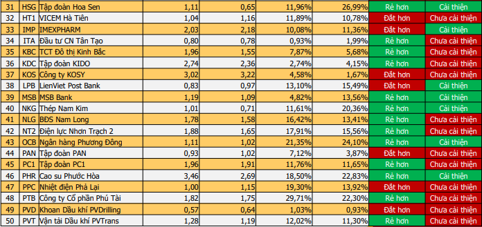 Với nhóm vốn hóa vừa, dù chỉ số VNMidcap đã giảm khoảng 30% kể từ đầu tháng 4 tới nay, tuy nhiên vẫn còn tới 41% cổ phiếu đang có định giá P/B đắt hơn định giá tại thời điểm trước dịch COVID-19. Đáng chú ý hơn, có tới 62% số cổ phiếu trong rổ VNMidcap hiện đang ghi nhận hiệu quả kinh doanh chưa cải thiện so với trước khi có dịch COVID-19, điều này có nghĩa khá nhiều cổ phiếu trong rổ cổ phiếu này hiện có định giá cao hơn nhiều so với hiệu quả kinh doanh thực tế.