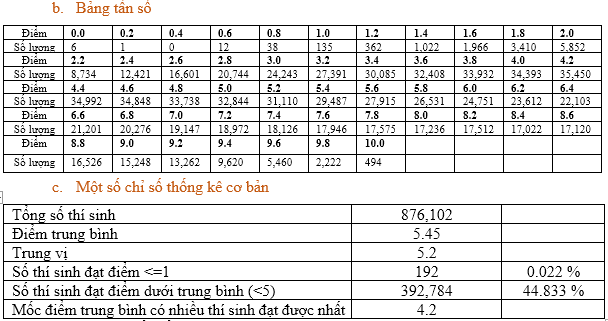Phổ điểm trung bình môn Tiếng Anh của năm ngoái là 5,15; số thí sinh đạt dưới 1 điểm là 423, chiếm 0,05%; số thí sinh đạt điểm dưới trung bình (dưới 5) là 446.648, chiếm 51,65%. Mốc điểm trung bình có nhiều học sinh đạt nhất là 3,8.