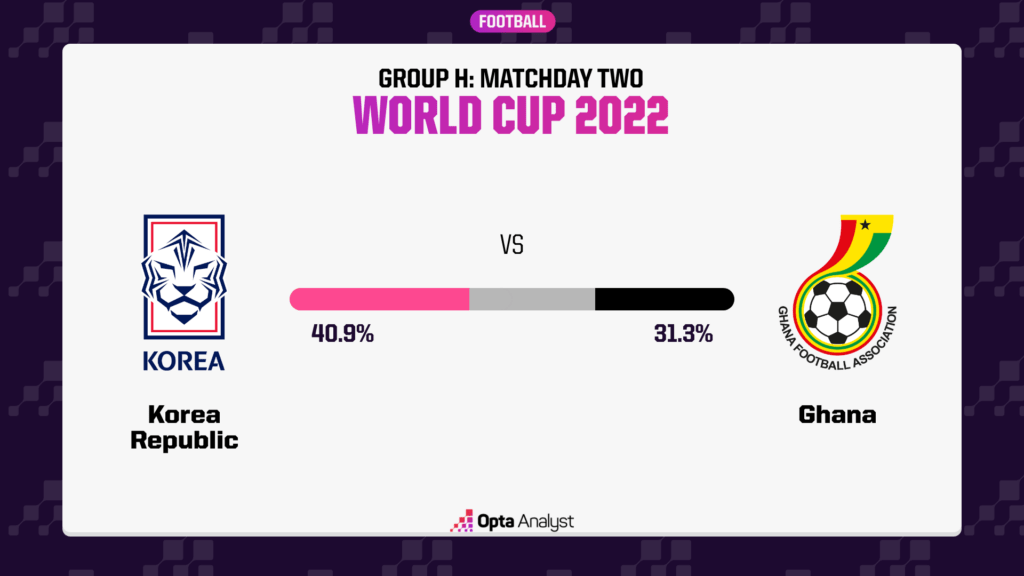 Với 40,9% cơ hội chiến thắng, Hàn Quốc vẫn được siêu máy tính của Opta đánh giá cao hơn đối thủ. Tuy vậy, khả năng giành chiến thắng của Ghana cũng không quá thấp: 31,3%. Một trận thua hoặc thậm chí tỷ số hòa (27,8%) là kết quả mà người hâm mộ xứ kim chi không mong muốn.