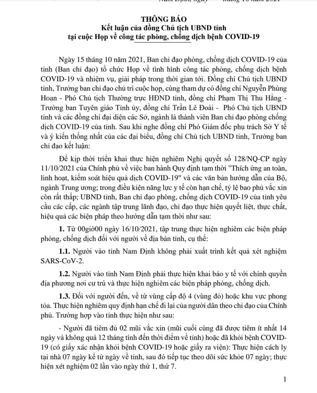17h chiều nay (15/10), Văn phòng UBND tỉnh Nam Định phát đi văn bản thông báo kết luận của Chủ tịch UBND tỉnh Phạm Đình Nghị tại cuộc họp kết thúc trước đó về công tác phòng, chống dịch bệnh Covid-19.