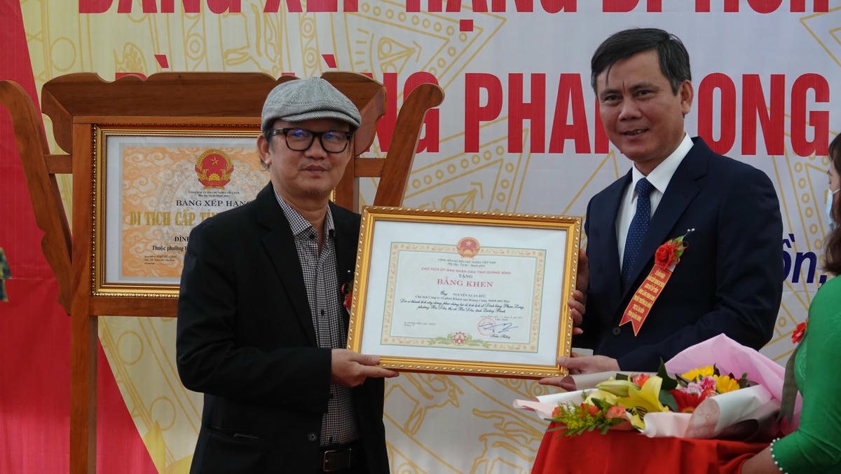 Tại buổi lễ, ông Trần Thắng, Chủ tịch UBND tỉnh Quảng Bình đã trao Bằng xếp hạng di tích lịch sử cấp tỉnh đình làng Phan Long cho địa phương và Bằng khen cho ông Nguyễn Xuân Đức, người có công lớn trong việc xây dựng lại đình làng.