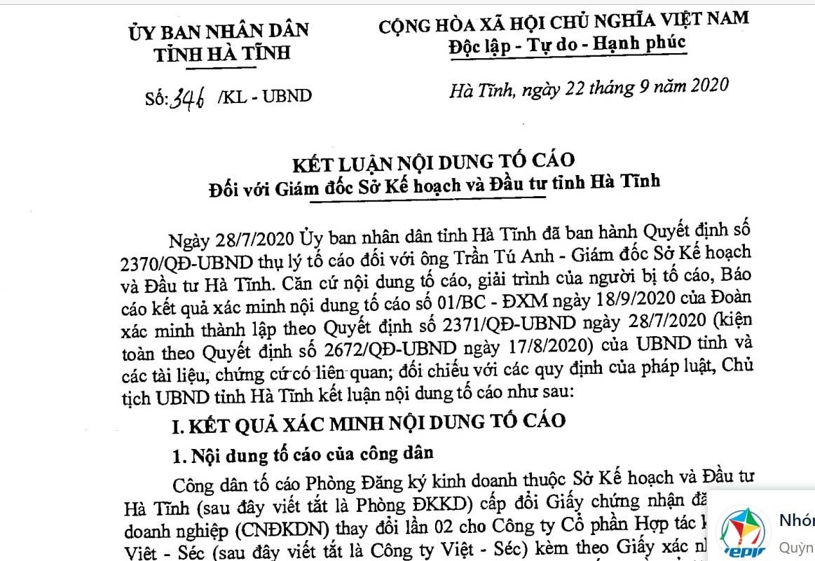 Đối với nội dung tố cáo Giám đốc Sở KHĐT, UBND tỉnh Hà Tĩnh kết luận: Việc công dân tố cáo Giám đốc Sở KHĐT ban hành Kết luận số 546/KL-SKHĐT ngày 17/3/2020 “Kết luận nội dung tố cáo đối với Phòng ĐKKD - Sở KHĐT Hà Tĩnh” không đúng quy định của pháp luật là có phần đúng.