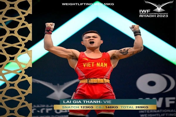 Ngày 6/9, tin từ Cục Thể dục Thể thao, hai đô cử Việt Nam là Lại Gia Thành và Ngô Sơn Đỉnh đã thi đấu xuất sắc để giành về ngôi Quán quân và Á quân hạng 55kg nam cho Cử tạ Việt Nam tại Giải Cử tạ vô địch thế giới diễn ra tại Riyadh, Ả Rập Xê Út. Trong đó, đáng chú ý là đô cử Lại Gia Thành đã có màn thi đấu bùng nổ khi mang về tới 3 chiếc Huy chương Vàng ở các nội dung cử giật (123kg), cử đẩy (146kg) và tổng cử (269kg) hạng 55kg nam.
