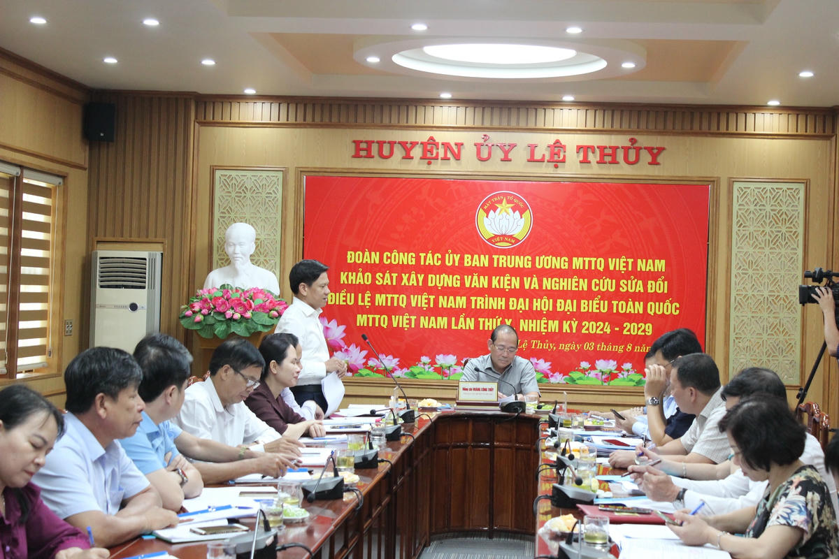 Ngày 3/8, đoàn khảo sát của Ủy ban Trung ương MTTQ Việt Nam do ông Hoàng Công Thủy - Phó Chủ tịch Ủy ban Trung ương MTTQ Việt Nam làm trưởng đoàn có chuyến làm việc với Ban Thường trực Ủy ban MTTQ Việt Nam huyện Lệ Thủy (tỉnh Quảng Bình) để lấy ý kiến phục vụ xây dựng văn kiện và nghiên cứu, sửa đổi Điều lệ MTTQ Việt Nam trình Đại hội đại biểu toàn quốc MTTQ Việt Nam lần thứ X, nhiệm kỳ 2024-2029.
