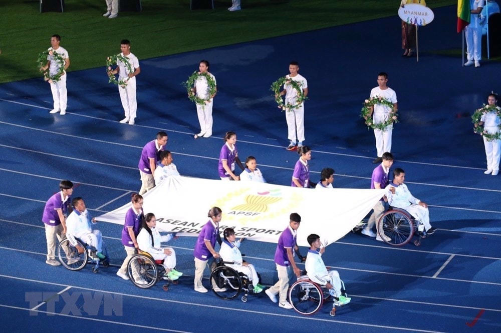 Tiếp theo đó là nghi thức rước cờ và chào cờ Liên đoàn Thể thao người khuyết tật ASEAN (APSF), cùng lời tuyên thệ của đại diện vận động viên người khuyết tật và lực lượng trọng tài.