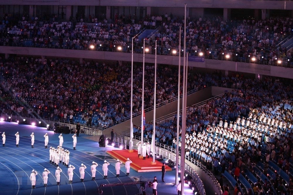 Tiếp nối sau đó là nghi lễ rước quốc kỳ và cử hành quốc ca của Campuchia. Đặc biệt, trong nghi thức chào cờ và thượng cờ, có tiết mục trình diễn ngôn ngữ ký hiệu của 40 người.