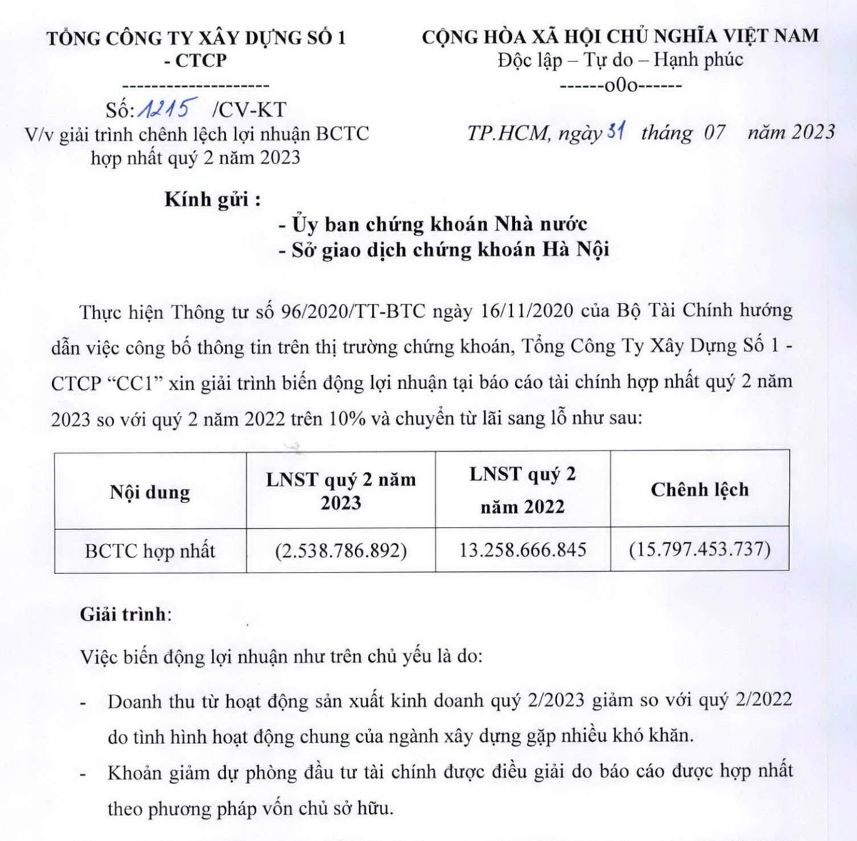 Giải trình biến động kết quả kinh doanh trong kì, bộ phận kế toán CC1 thông tin, hoạt động sản xuất kinh doanh quý II/2023 giảm so với quý II/2022 do tình hình hoạt động chung của ngành xây dựng gặp nhiều khó khăn.