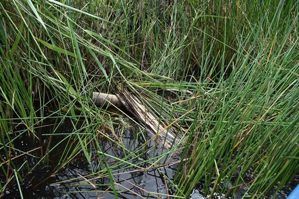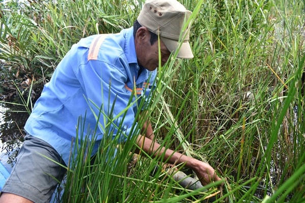 Sắp đến nơi, ông Lâm vội tắt máy rồi lấy cây dầm (đoạn cây dài – PV) để bơi chiếc vỏ di chuyển vào bên trong. Bơi được một đoạn, ông Lâm chỉ tay về phía có ống trúm đang đặt trong bụi năng (loại cỏ dại trong rừng nước ngọt – PV) rồi nói: “Trúm này chắc có lươn”. Dứt lời, ông rời khỏi chiếc vỏ lãi, nhảy xuống nước di chuyển về phía có ống trúm. Vén lớp cỏ phủ trên ống trúm, ông Lâm nâng lên cao lắc nhẹ, ông nhìn ngó vào bên trong.