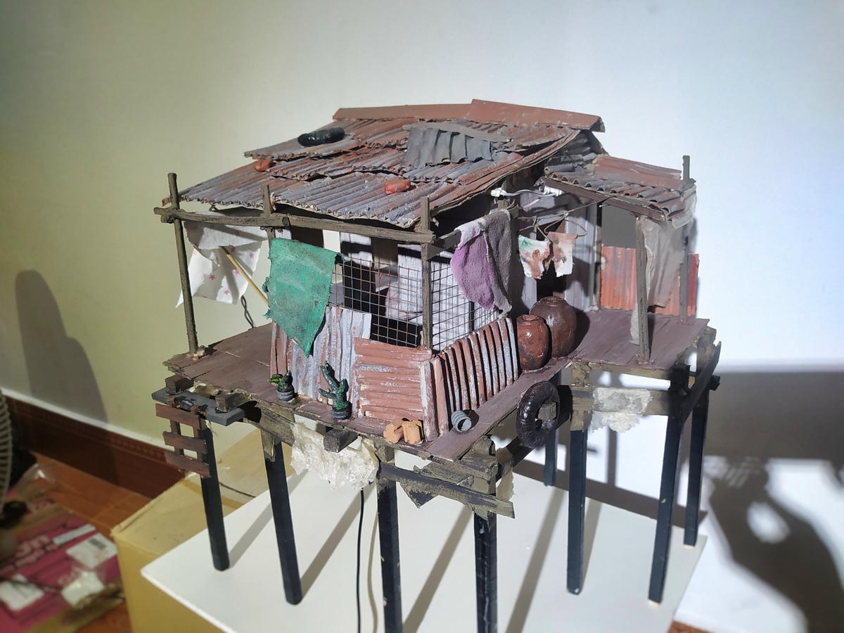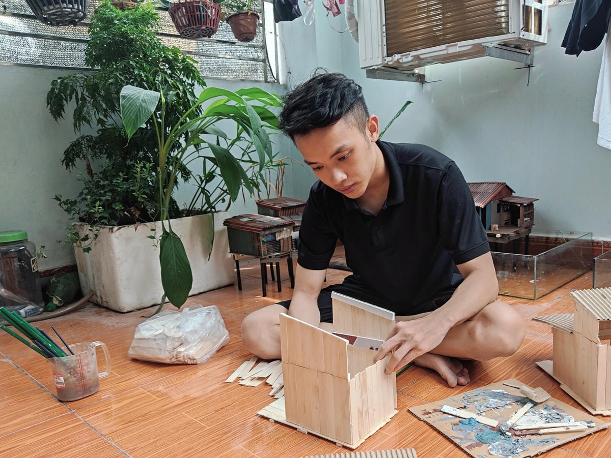 Từ nhiều năm nay, Vũ Thạch Dương - sinh viên Cao đẳng nghề Hải Dương đã thích thú với bể thủy sinh. Do chưa tự lập về kinh tế, việc chơi tiểu cảnh đắt tiền vượt quá khả năng chi tiêu, cậu quyết định tự tay làm một mô hình tái hiện những ngôi nhà trên sông theo phong cách riêng.