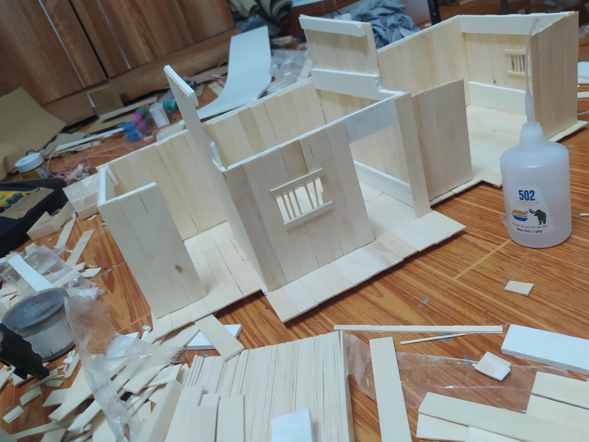 Những nguyên liệu để làm nhà mini này đều dễ kiếm và đơn giản: bìa carton, que kem (que đè lưỡi), tấm nhựa quảng cáo đi xin từ các quán, que gỗ, keo 502, đất nặn và màu vẽ.
