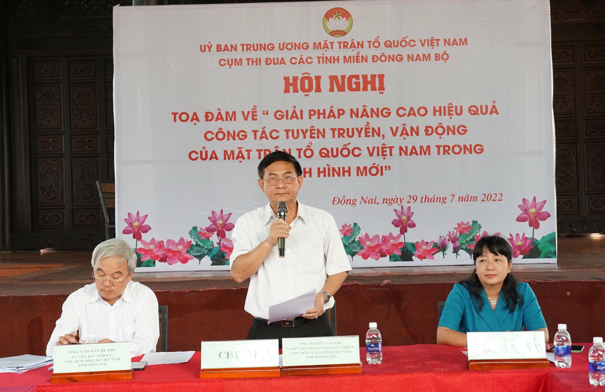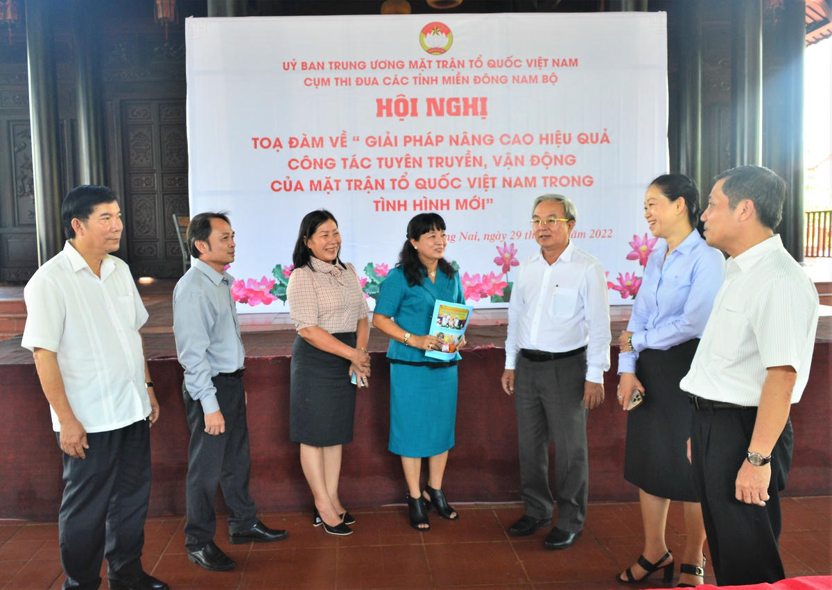 Ngày 29/7, tại Đồng Nai, Ủy ban MTTQ Việt Nam các tỉnh thuộc cụm thi đua miền Đông Nam bộ đã tổ chức hội nghị tọa đàm về “Giải pháp nâng cao hiệu quả công tác tuyên truyền theo Đề án số 01/ĐA-MTTW-BTT, ngày 5/5/2015 của Ban Thường trực UBTƯ MTTQ Việt Nam và công tác vận động của MTTQ Việt Nam các cấp trong tình hình mới” năm 2022.