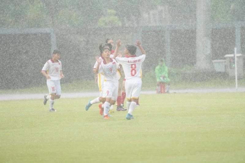 Không nằm ngoài dự đoán, mặc dù trận đấu bắt đầu với cơn mưa khá to nhưng các cầu thủ U19 nữ Việt Nam vẫn nhanh chóng làm chủ thế trận, có bàn thắng mở tỉ số ngay phút thứ 7 do tiền đạo trẻ Lưu Hoàng Vân (9) lập công. 7 phút sau bàn mở tỉ số, đến lượt cây săn bàn từng tỏa sáng ở VL 1 U20 nữa châu Á 2024 vừa qua Ngọc Minh Chuyên (10) ghi bàn, nâng tỉ số lên 2-0 cho đội tuyển Việt Nam. Chưa dừng lại ở đó, trong hai phút 16 và 17, lợi dụng sự lúng túng của đối phương, lần lượt Hồ Thị Thanh Thảo (4) và tiền đạo Lưu Hoàng Vân (9) nhanh chóng có cú đúp tại giải khi tiếp tục ghi bàn nâng tỉ số lên 4-0 cho U19 nữ Việt Nam.