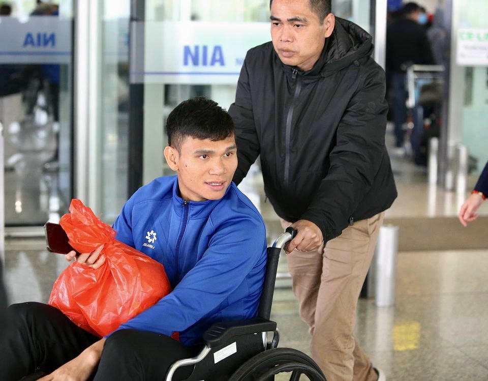 Trong ngày 25/1, cùng một nhóm thành viên của đội tuyển Việt Nam về tới Hà Nội từ Qatar, hậu vệ Phạm Xuân Mạnh phải di chuyển bằng xe lăn.