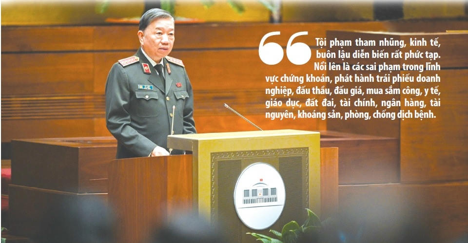 Báo cáo về công tác phòng, chống tội phạm và vi phạm pháp luật năm 2022, Bộ trưởng Bộ Công an Tô Lâm cho biết: Tội phạm tham nhũng, kinh tế, buôn lậu diễn biến rất phức tạp. Nổi lên là các sai phạm trong các lĩnh vực chứng khoán, phát hành trái phiếu doanh nghiệp, đấu thầu, đấu giá, mua sắm công, y tế, giáo dục, đất đai, tài chính, ngân hàng, tài nguyên, khoáng sản, phòng, chống dịch bệnh. “Số vụ phạm tội về trật tự quản lý kinh tế phát hiện giảm 36,68%, số vụ phạm tội về tham nhũng và chức vụ phát hiện tăng 40,97%” - Bộ trưởng cho hay.