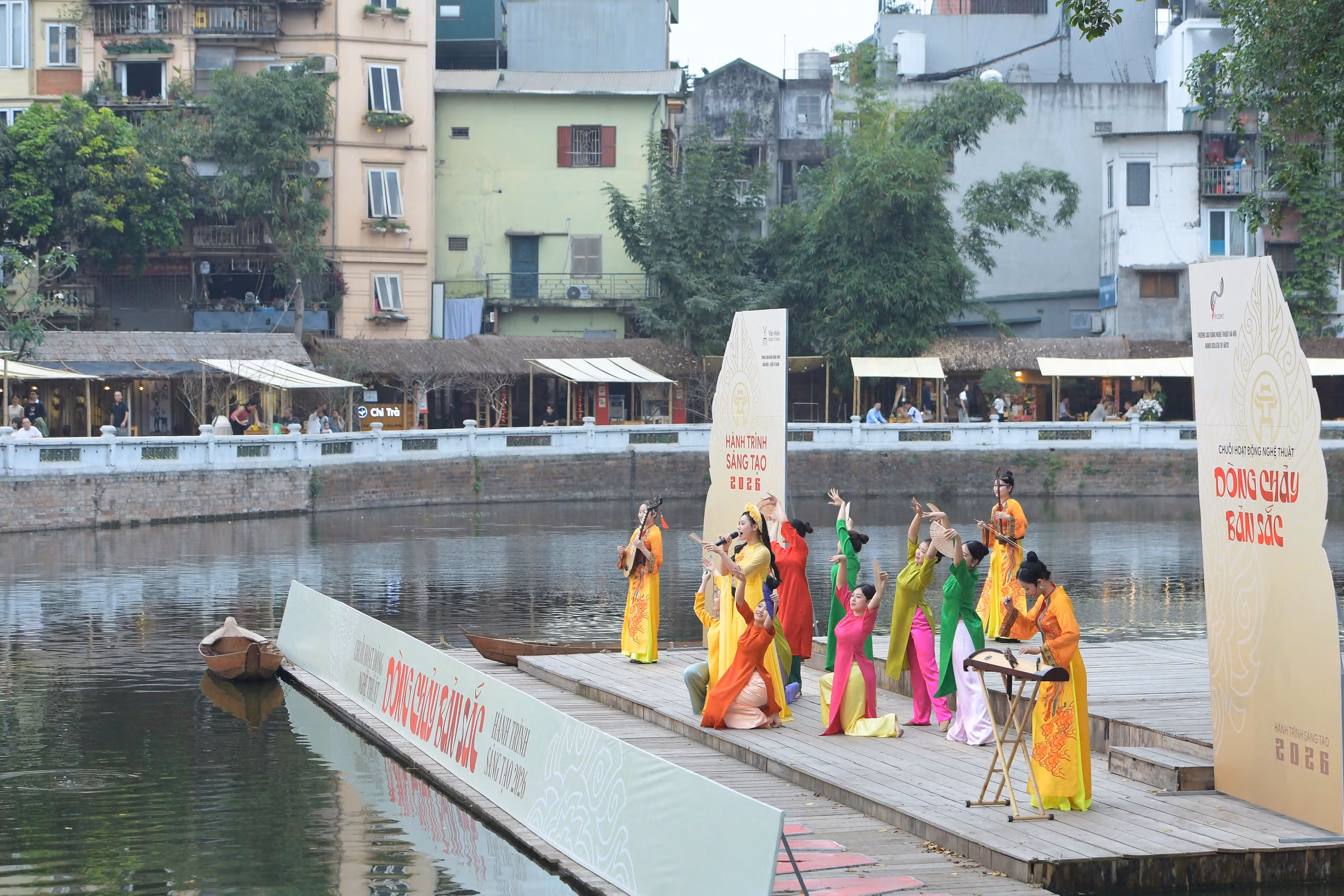 Ngày 21/3, tại khu vực Hồ Văn, Văn Miếu - Quốc Tử Giám (Hà Nội), chương trình “Dòng chảy bản sắc - Hành trình sáng tạo năm 2026” đã diễn ra với nhiều hoạt động nghệ thuật đặc sắc, thu hút đông đảo công chúng và giới trẻ tham gia.
