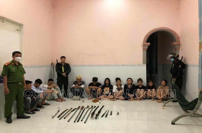 Trước đó, lúc 23 giờ 30 phút ngày 22/8, Công an xã Xuân Tâm phối hợp với Đội Cảnh sát hình sự Công an huyện Xuân Lộc tiến hành kiểm tra hành chính một khu nhà trọ tại ấp 7, xã Xuân Tâm. Tại đây, lực lượng chức năng phát hiện một nhóm thanh niên (5 nam và 7 nữ) độ tuổi từ 15-23 tuổi đang tụ tập có nhiều biểu hiện nghi vấn. Kiểm tra nhanh phòng của nhóm thanh niên trên, công an thu giữ được 2 kiếm Nhật, 5 dao tự chế, 3 dao rựa, 2 gậy ba trắc và 1 bình xịt hơi cay.