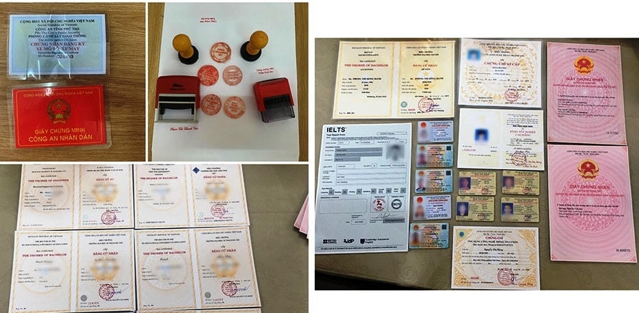 Quá trình khám xét, lực lượng công an phát hiện và thu giữ nhiều máy móc thiết bị, con dấu của cơ quan tổ chức phục vụ cho việc làm giấy tờ giả cùng hơn 100 loại giấy tờ như: bằng tốt nghiệp của các sơ sở đào tạo liên quan ngành giáo dục, sổ đỏ, giấy phép lái xe, giấy đăng ký xe, thẻ căn cước công dân gắn chíp điện tử, giấy chứng nhận Công an nhân dân cùng rất nhiều loại giấy tờ khác. Cơ quan Công an cho biết, tất cả các loại giấy tờ nói trên đều được làm giả.