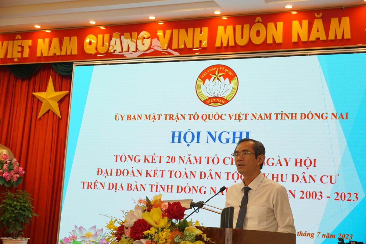Phát biểu tại lễ tổng kết, Thường trực Tỉnh ủy Đồng Nai đánh giá cao cũng như biểu dương những kết quả mà Mặt trận các cấp trong tỉnh đạt được trong 20 năm tổ chức Ngày hội Đại đoàn kết toàn dân tộc. Lãnh đạo Thường trực Tỉnh ủy Đồng Nai mong muốn, Mặt trận các cấp trong tỉnh tiếp tục đổi mới và nâng cao chất lượng tổ chức Ngày hội Đại đoàn kết toàn dân tộc ở khu dân cư; phát huy quyền làm chủ trực tiếp của nhân dân, góp phần thực hiện quy chế dân chủ ở cơ sở, thông qua tổ chức Ngày hội tạo điều kiện thuận lợi để nhân dân tham gia góp ý xây dựng đảng, xây dựng chính quyền và hệ thống chính trị ở địa phương ngày càng trong sạch, vững mạnh; củng cố và phát huy sức mạnh khối đại đoàn kết toàn dân tộc, tăng cường đồng thuận xã hội góp phần hoàn thành nhiệm vụ chính trị và phát triển kinh tế - xã hội của địa phương, tỉnh Đồng Nai.