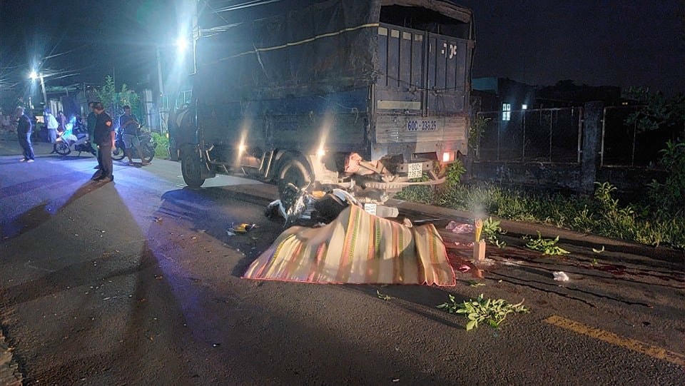 Tới hơn 23h khuya 25/4, Công an huyện Trảng Bom, tỉnh Đồng Nai vẫn đang khám nghiệm hiện trường vụ xe máy tông đuôi xe tải làm 2 người chết.