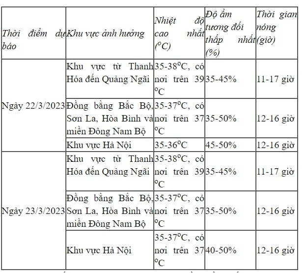 Dự báo diễn biến nắng nóng trong 24 giờ đến 48 giờ tới: Ở khu vực đồng bằng Bắc Bộ, các tỉnh Sơn La, Hòa Bình có nắng nóng diện rộng với nhiệt độ cao nhất phổ biến 35-37 độ, có nơi trên 37 độ, độ ẩm tương đối thấp nhất 35-50%; khu vực từ Thanh Hóa đến Quảng Ngãi có nắng nóng và nắng nóng gay gắt, có nơi đặc biệt gay gắt với nhiệt độ cao nhất phổ biến 35-38 độ, có nơi trên 39 độ, độ ẩm tương đối thấp nhất 35-50%; các nơi khác ở Bắc Bộ và khu vực từ Bình Định đến Phú Yên có nắng nóng cục bộ với nhiệt độ cao nhất phổ biến 35-36 độ, có nơi trên 36 độ, độ ẩm tương đối thấp nhất 45-55%.