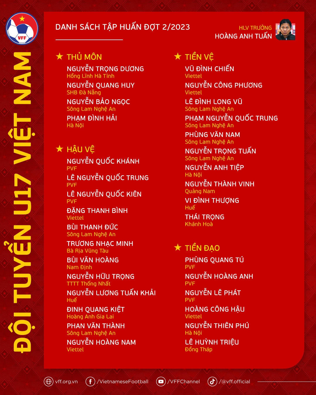 Nằm trong kế hoạch chuẩn bị cho VCK U17 châu Á 2023, ĐT U17 Việt Nam dưới sự dẫn dắt của HLV trưởng Hoàng Anh Tuấn đã hội quân trở lại với 32 cầu thủ được triệu tập.
