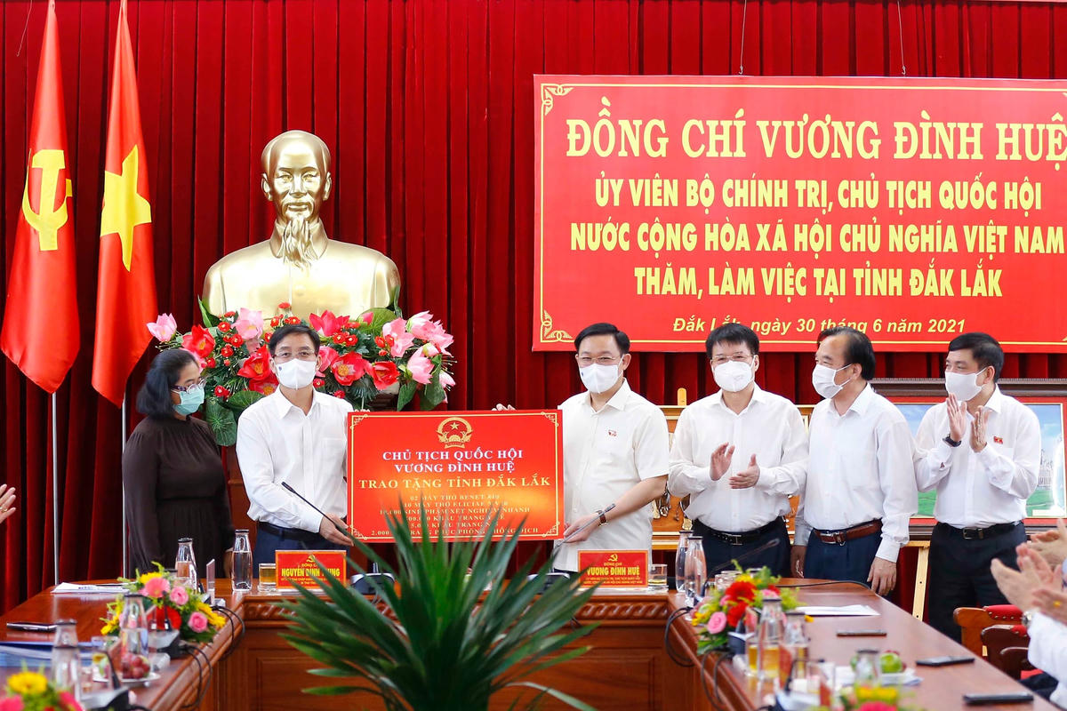 Tại buổi làm việc, Chủ tịch Quốc hội, Đoàn công tác cùng lãnh đạo tỉnh Đắk Lắk đã chứng kiến UBTƯ MTTQ Việt Nam trao tặng tỉnh Đắk Lắk 1 tỷ đồng; Bộ Y tế tặng lô thiết bị y tế trị giá 5 tỷ đồng; Tập đoàn Đầu tư và Kinh doanh Golf Long Thành trao tặng 5 tỷ đồng để xây dựng trường học.