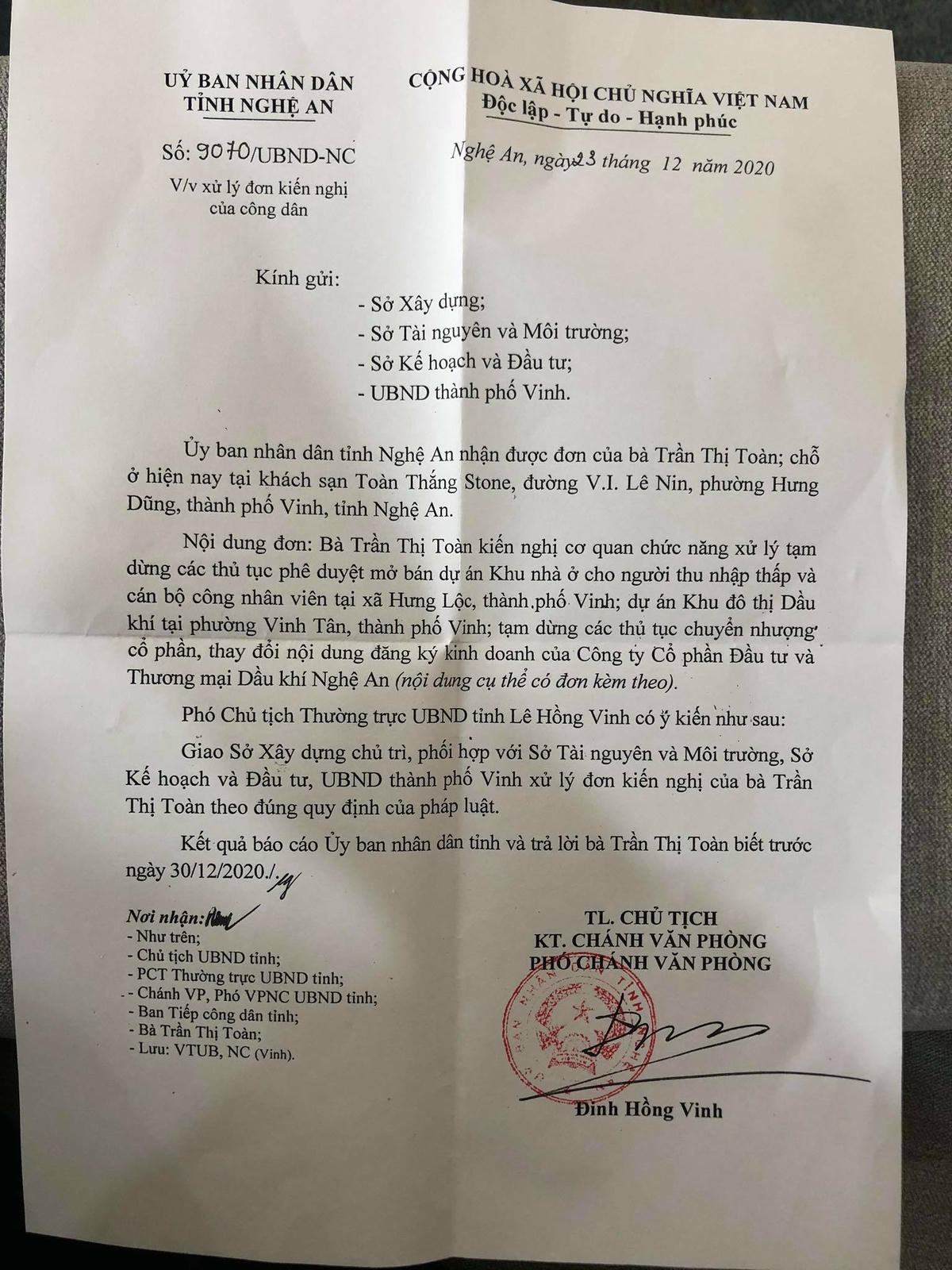 Báo Đại Đoàn kết đã có bài viết phản ánh Dự án “Khu nhà ở cho người thu nhập thấp và cán bộ công nhân viên” tại xã Hưng Lộc, TP Vinh tỉnh Nghệ An (gọi tắt là Dự án Hưng Lộc), dù bị đình chỉ nhưng vẫn thi công rầm rộ, thậm chí đã rao bán trái quy định. Không những Sở Tài nguyên và Môi trường (TNMT) có văn bản tiếp tục đình chỉ việc thi công mà UBND tỉnh Nghệ An cũng yêu cầu làm rõ đơn tố cáo liên quan đến dự án này.