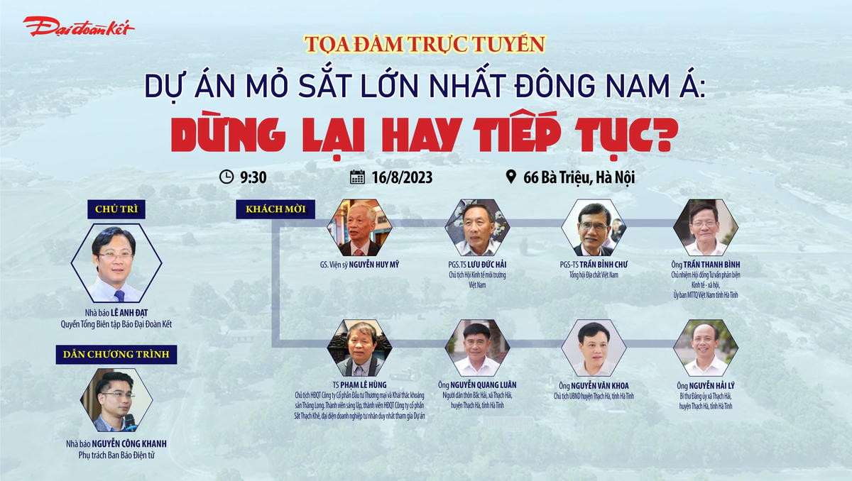 Tọa đàm trực tuyến “Dự án mỏ sắt lớn nhất Đông Nam Á: Dừng lại hay tiếp tục?” được tổ chức vào 9h30 ngày 16/8/2023; tường thuật trực tiếp trên Báo điện tử Đại Đoàn Kết (daidoanket.vn).