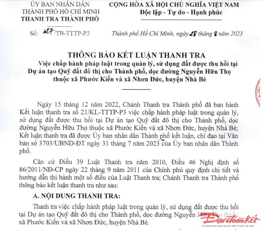 Việc các cơ quan chức năng TP HCM vào cuộc và đưa ra kết luận thanh tra tại Dự án Quỹ đất đô thị cho TP HCM dọc đường Nguyễn Hữu Thọ thuộc xã Phước Kiển và xã Nhơn Đức, huyện Nhà Bè (TP HCM) đã được triển khai từ cuối tháng 12/2022. Sau đó, UBND TP HCM đã vào cuộc xem xét, đi đến quyết định.