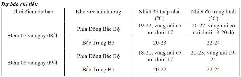 Khu vực phía Đông Bắc Bộ trong 2 ngày 8-9/4 đêm và sáng trời rét, ngày trời lạnh, vùng núi trời rét. Khu vực Bắc Trung Bộ trời lạnh. Trong đợt không khí lạnh này, nhiệt độ thấp nhất ở phía Đông Bắc Bộ phổ biến 18-21 độ, vùng núi có nơi dưới 17 độ.