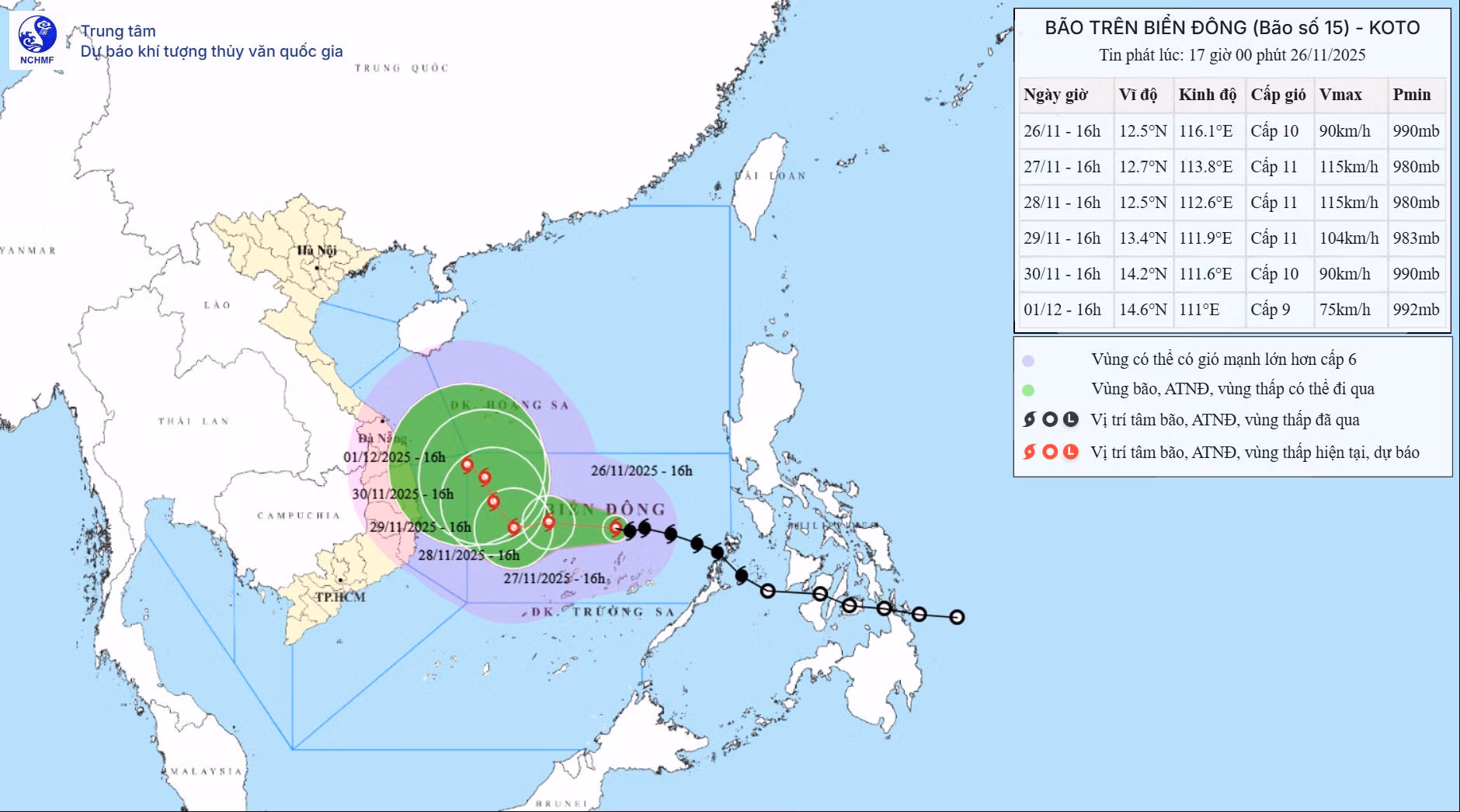 Chiều 26/11, Trung tâm Dự báo khí tượng thủy văn quốc gia cung cấp thông tin về cơn bão Koto (bão số 15). Theo đó có 2 kịch bản đối với đường đi của bão số 15.